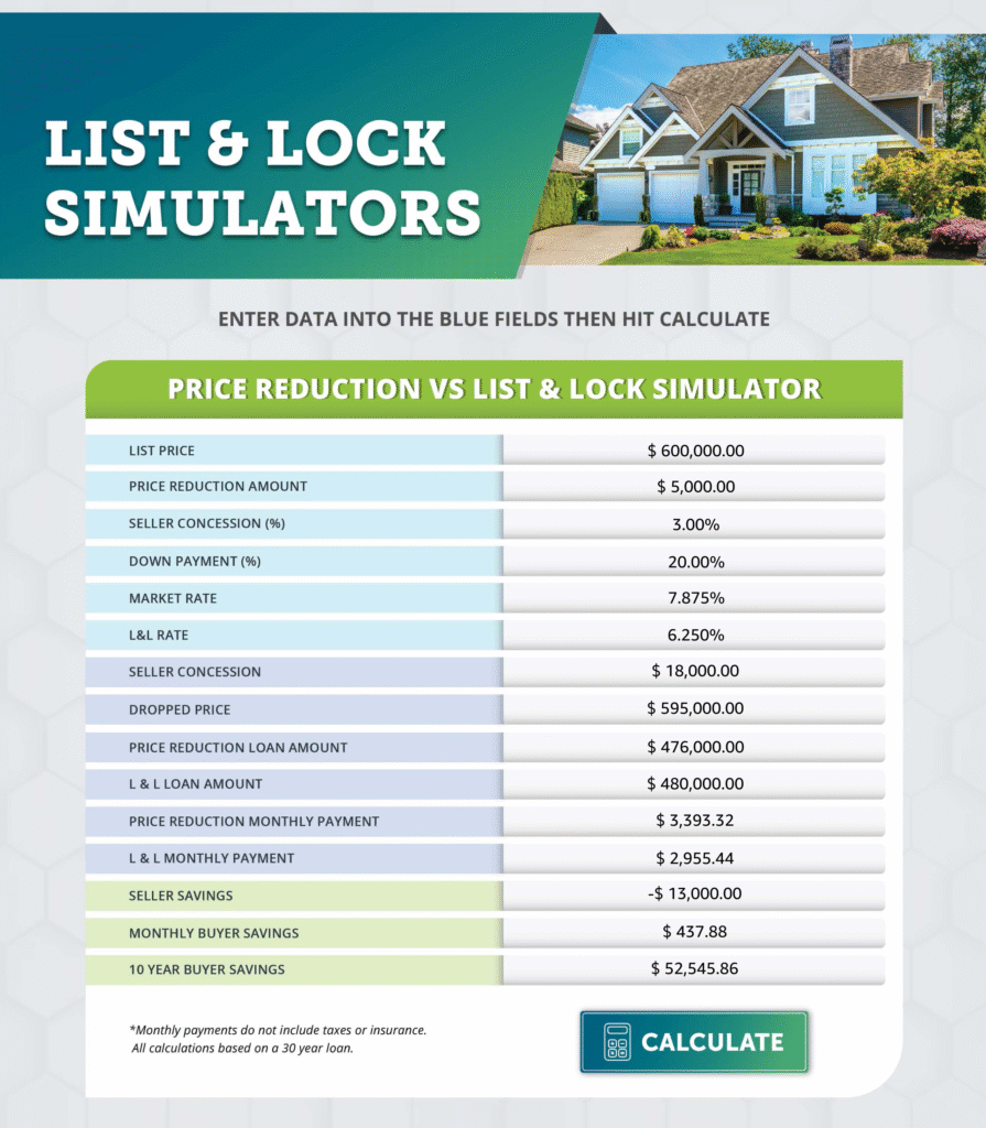 Download these PDFs to show your clients the power of List & Lock. You enter data into the top rows, and the tools will show you the pricing differences for List & Lock compared to a price reduction or to market rates.